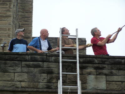 Other volunteers, left to right, Kevin Helmick, Eddie Harris, Craig Gherke and Richard Kirby prepare to lower the stone from courthouse annex Volunteers took care of a safety problem on the courthouse annex yesterday. Lightning struck the old jail building's chimney Tuesday night, dislodging a number of cut stones, which fell to the ground and through an aluminum porch cover. At least one large cut stone was precariously hanging on the chimney's edge, and workers tied a rope about the stone to lower it to the ground. While the heavy stone was being lowered, the rope broke and the stone fell through the already damaged porch cover.