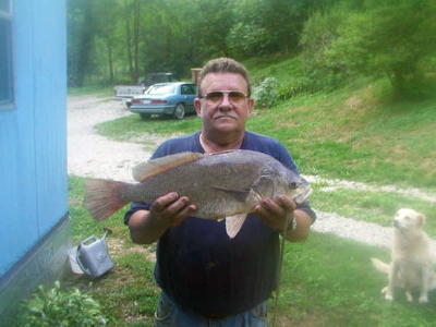 A BIG ONE - Jerry Riddle of Big Bend caught this white perch at Backbone Rock in the Little Kanawha River Bend. The fish weighed six pounds and was 24 inches long (Photo by Joy Riddle)