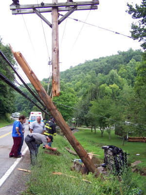 ![]() Auto clips pole and lands in creek A large electric pole was sheared-off after it was struck by a car on Phillip's Run shortly before 7 a.m. Thursday, the car landed in the creek. Matt Kirby of Mt. Zion received minor injuries in the crash, although the vehicle was heavily damaged. Kirby was traveling on Rt. 16 about the time a small rain began to fall on the area. After the electric company came to replace the pole, electric service was off to part of the county about four hours. Responding to the call was the Grantsville Volunteer Fire Department and Deputy Sheriff Justin Metheney. Kirby, a member of the Grantsville VFD, continued to respond to other emergency calls after his accident.