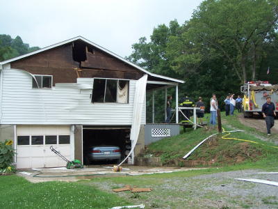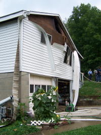 ![]() Walls of house were bulging following blast Fortunately, no one was in the building, which had a rental sign on the front yard. Brandon Deel, who lives two houses from the building, said the explosion rocked the area. The structure is owned by Otis and Jean Miller, who live next door to the damaged house. They were not at home at the time. Deel said "I ran to the house and hooked up a garden hose to put out a fire," which erupted after the blast. "It sure shook the valley," he said. When the Grantsville Fire Department arrived, things had settled down. Sheriff Carl Ballengee and Deputy Justin Metheney responded to the explosion with Calhoun EMS.