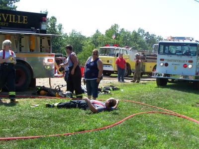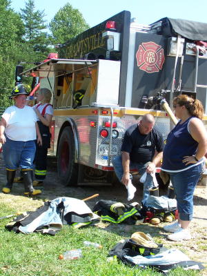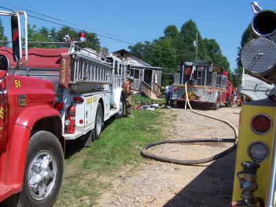 Pam Robinson and son Caleb comfort each other (left) The Grantsville Volunteer Fire Department responded to a 911 call at 1:52 p.m., with the Smithville VFD also responding with four units. Firemen made entry inside the house with breathing apparatus, also enduring the outside temperature exceeding 90 degrees. The family is looking for a place to stay, with a loss of nearly all their possessions. For information on how you can help, call 304-275-3387, Ms. Robinson's parents James and Estel Tedrick of Creston.