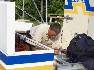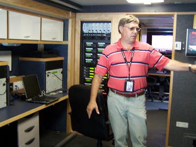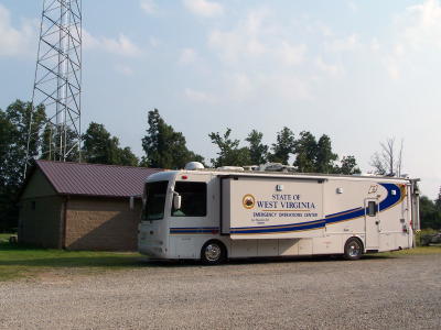 Calhoun resident Bill Wood, the state's communication The van not only has radio transmitters for multiple frequencies, but is satellite-linked to Charleston and other emergency channels. A 50-foot antenna can also be extended from the van for quick operation. The van has multiple TV screens hooked to a satellite system. The van's transmitters have been hooked to the center's nearly 200 foot antenna. "Things are working well tonight," said dispatcher Kathy Wood, with the center "having lots of people working on equipment." Technicians with the Emergency Operations Center are remaining on-site with the van. Yesterday, the center was switched to the alternate operations center established at the Arnoldsburg Volunteer Fire Department. "People have been working around the clock, and lots of people have been helping," said Wood, including free pizza from the Pit Stop.