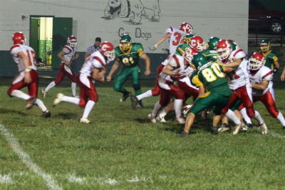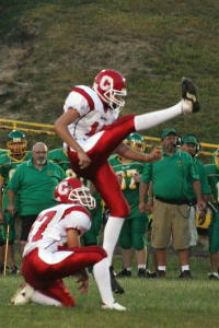 By Gaylen Duskey Another game, another win, another shutout ⦠That was exactly what happened Friday night as the Calhoun Red Devils ran their record to 3-0 with a 34-0 victory over Doddridge County in a game played at West Union. With the shutout Calhoun has now outscored its opponents 145-0 on the season. The Red Devils dominated the Bulldogs both offensively and defensively yet still had to settle for a couple of field goals on its first two series as junior kicker Nick Whytsell hit from 25 and 27 yards in the first period before getting their first touchdown. That score came when Roman Rader scooped up a Bulldog fumble and scored from six yards out as the first quarter was winding down. Jeff Goodrich added the extra points. Jeremy Conley scored the first of his two touchdowns on a 14-yard run right before the half. Calhoun added a second Conley touchdown in the fourth quarter and a 14-yard run by Caleb Hart in the third to set the final score. Statistically the Red Devils were even more dominant with 25 first downs (Doddridge had six) and 350 yards total offense - 250 on the ground and 100 from the passing of senior quarterback Matt Houchin. Hart led the way on the ground for Calhoun with 114 yards on 16 carries while Goodrich added 74 on 21 attempts. Josh DeWeese was Houchin's favorite target with four receptions for 28 yards. With the win Calhoun goes to 3-0 heading in to Friday night's home game against Parkersburg Catholic.