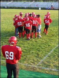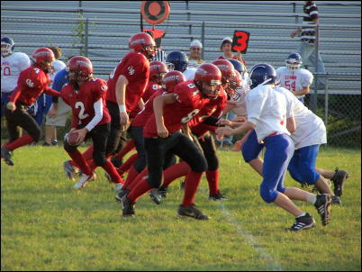 By Dan Cosgrove The Calhoun Middle School Football team played their 3rd game of the season last night, falling to the Gilmer County Titans by a score of 0-20. Calhoun dominated the clock in the first quarter. Starting on their own 35-yard line, Jared Haught was the workhorse, carrying the ball on 9 plays, marching the ball to Gilmer's 24-yard line. Cory Metz also added some yards on the drive. However, they were stopped on a fourth down play and Gilmer took over on downs. With only 13 seconds left in the 1st quarter, Gilmer made only one play for a loss of 9 yards. The second quarter started with Gilmer having to punt the ball on a 4th down play. Calhoun fumbled the ball and Gilmer recovered. Gilmer was plagued with penalties and when it looked like they were going to be stopped, made a 60-yard pass for a touchdown. On the following kickoff, Calhoun returned the ball to their own 33-yard line. Again Calhoun dominated the clock as they marched down the field. With just over 3 seconds left to play in the half, and Calhoun on Gilmer's 35-yard line, they threw a pass which was intercepted and ran back for a touchdown. Gilmer made the 2-point conversion and the half ended with Gilmer leading 14 to 0. The second half started with Calhoun kicking off to Gilmer. Phillip Norman made a nice tackle on the 27-yard line, where Gilmer started their drive. After an incomplete pass and a false start penalty, Gilmer was looking at a 2nd and 15. Picking up 12 yards, it was 3rd and 3. Trent Phillips and Evan Mace teamed up and held them to no gain! Gilmer was forced to kick. Calhoun took over on their own 34-yard line. On their first offensive play of the half, Nathan Cosgrove ran the ball for 10 yards only to be called back on a holding penalty. Now 1 and 20, he gained 10 back, lost 4 yards on second down, and made a first down to the 46 yard line on the 3rd down. The next set of downs went 4 and out, with an incomplete pass. Gilmer took over with 1:29 left in the 3rd quarter. Gilmer got off two plays before the third quarter ended. Seth Wease made the tackle of the game on 2nd and 14. It looked like the Gilmer player was about to break open for a large run when Wease pounded into the runner. You could hear and feel the impact in the stands.