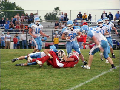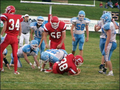 By Gaylen Duskey Despite playing without two-way standout Caleb Hart and having a plethora of penalties Calhoun kept its record unblemished with a hard-fought 19-6 win over Parkersburg Catholic Friday night at Mount Zion. Calhoun got touchdowns from Matt Houchin, Jeff Goodrich and Josh DeWeese in running its record to 4-0 while Catholic dropped to 1-3. The Red Devils took the opening kickoff and drove down the field with relative ease in a mistake free 14-play, 75-yard drive. Houchin scored from a yard out and Nick Whytsell added the extra point for the 7-0 lead. After that the Red Devils suffered from penalties and a great pass from Crusader quarterback to John Boelter. A missed extra point attempt left the Red Devils on top 7-6. Prior to the Crusaders? touchdown Calhoun appeared to be poised to take a two-touchdown lead with a first-and-10 at the PCHS? 27. Then penalties struck. On the aborted three-play series the Red Devils managed 40 yards in penalties and a quarterback sack to be facing a fourth-and-58 situation from deep in its own territory. Parkersburg Catholic took advantage and quickly scored on a drive with the touchdown coming on a 31-yard pass play.