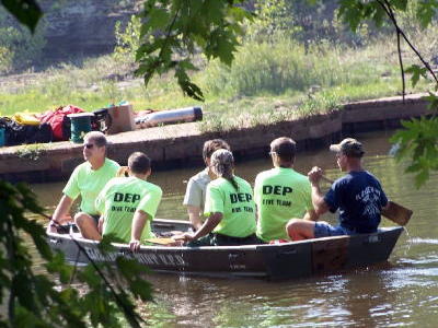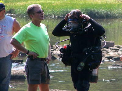 ![]() A team of Department of Environmental Protection divers and inspectors recently completed a second review of the 19th Century dam. The review came as a result of requests from the Wirt County Commission and the U.S. Army Corps of Engineers to investigate the dam, a vintage structure that holds a lot of river transportation history. The Little Kanawha Navigation Company built the structure on the Little Kanawha River near Elizabeth in the late 1800s. It was just one in a series of waterway structures designed to allow barge traffic to float from Parkersburg to Grantsville. By the 1930s, Route 5 had reduced the need for barge traffic and many of the original lock and dam structures fell into disrepair. Although the Wells Lock and Dam eventually lost the ability to lock through barge traffic, the dam was repaired and saved from being removed in the 1950s. Now, almost 60 years later, the dam is in need of repair once again. Wells Lock and Dam consists of eight round metal columns, filled with rock and sealed in concrete. Divers examined the dam's structural integrity on the upstream side. Although underwater visibility was less than seven inches, divers easily located problem areas. The steel barrier was heavily corroded, but no holes or undercuts were found. On the downstream portion, however, several major undercuts and large holes were discovered. Problem areas were documented with measurements, photographs and video. The DEP is working with the Corps, DNR and the Wirt County Commission to study possible repair of the structure.