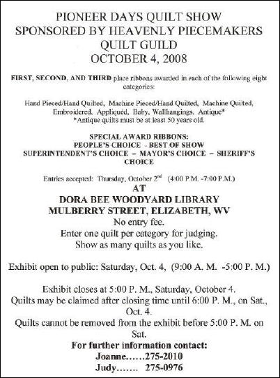 ![]() Schedule of Activities Music and Stage Area 10:00-11:00 A.M. Opening - Bob Stanley - Sermon - Bishop William Boyd Grove 11:00-12:00 A.M. Dr. Virginia Gray, "Local Ghost Tales" 1:00- 2:00 P.M. Country Mix 2:00- 3:00 P.M. Chichesters 3:00- 4:00 P.M.   Calhoun Cousins 4:00- 5:00 P.M.  Gospel Four 5:00- 6:00 P.M.  Tom and Carol Wriston 6:00- ? P.M. Street Dancing with Tom Poe Special Events 9:00 A.M. - 5:00 P.M. Quilt Show - Dora B. Woodyard Memorial Library 9:00 A.M. - 3:00 P.M. Car Show - Wirt High School Parking Lot 10:00 A.M. - 3:00 P.M. Beauchamp-Newman Museum Tours 11:00 P.M. & 1:00 P.M. Scotch-Irish Bagpipe Music - Anna Border - Museum 11:00 A.M. - 12:00 P.M. Dr. Virginia Gray, "Local Ghost Tales" Stage 12:00 P.M. "Corbett's Story Telling Tent' - Mulberry Street 11:00 A.M. - 5:00 P.M. Little Kanawha Hotel Tours 4:30 P.M. - 8:00 P.M. Spaghetti Dinner & Mini-Extravaganza - Fire Dept. Activities 1:00 P.M. FBLA Corn Hole Bag Tournament - High School 2:00 P.M. LuAnn McVey's Middle School Dancers - Mulberry Street 3:00 P.M. Bed Race - Mulberry Street 4:00 P.M. Skillet Throw - (sponsored by Mom's Place) - Museum SCENES FROM 2007