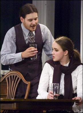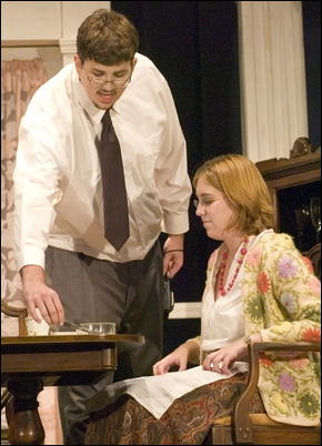 Edmond White, as a visiting nephew so offends his Even the simple stage construction - a room without walls - focused the audience's attention on the actors. The audience is whisked through conversations between grandparents and grandchildren, a man coming home to announce he must defend the family's honor, girls cautiously getting into a liquor cabinet, a maid and her employer, a woman whose life is falling apart pleads with her father to allow her to move back home, and a father talking with his son about funeral arrangements ... to name a few. Freshman members of the cast were Whitney Stalnaker, Edmond White, Sarah Sivard and Ryan Konarske. Stalnaker and Sivard are local residents with previous theatrical experience. Stalnaker has been working with the GSC theater department since she was 13. White, acting in his second play, is from Webster County. Konarske, of Spencer, was previously in three high school productions. Rounding out the cast are Josh Ellison, of Clay County, who has been involved in most GSC productions over the past five years. Zack Cyriacks, of Braxton County, has appeared previously in two productions. Lois Miller, an employee of Glenville State College, has appeared in many local performances since 1982.
