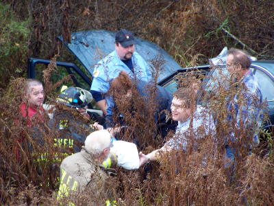 Grantsville and Smithville firemen with Verlin Millican of Big Springs was injured about 9 a.m. today when he lost control of his vehicle at the intersection of Leading Creek and Rt. 16 near Big Springs. The well-known fiddle player was taken to Camden-Clark Hospital in Parkersburg after the Grantsville and Smithville Fire Departments and Calhoun EMS extracted him from his vehicle. Millican's car plunged over an embankment in a rain-slick turn, trapping him in his car. Sources at the scene indicated Millican was not critically injured. |