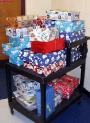 Each class "adopted" a boy and a girl child. Students brought in items to fill two shoe boxes. They also brought in money donations to cover the shipping and handling of the shoe boxes. We would like to especially thank parents for giving so generously to this effort. We would also like to thank those who donated the time to wrap the shoe boxes and deliver them. We feel this is a very important and worthwhile cause and value everyone's involvement in the project and appreciate all of your continued help in trying to teach our students the importance of giving to others. We hoped to gather enough items for 26 boxes and we exceeded that goal by collecting 35 boxes to send to children in our own country and around the world. Thanks again for such a great effort! |