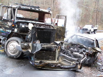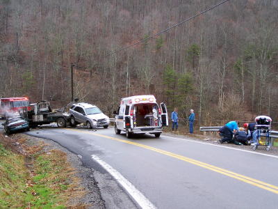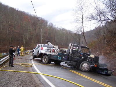 ... who was life-flighted to CAMC by HealthNet By Bob Weaver Four people were injured when a car and wrecker collided in a sharp turn on Rt. 16 south of Chloe Monday afternoon, with the vehicles catching on fire. The driver of the car sustained serious injuries including a fractured leg and was life-flighted from Upper West Fork Park to Charleston Area Medical Center. He was identified as Roger Jones, 38, of Arnoldsburg. Also taken to CAMC by ambulance was Kim Tanner, about 24, of Arnoldsburg and Jones' son, 15-year-old Rodrea Jones. The King wrecker driver from Clay was identified as Jack Schastall, 39. He was also taken to CAMC for evaluation. The wrecker was towing a vehicle. Calhoun Sheriff Carl Ballengee said he had not interviewed the drivers, indicating "the investigation is ongoing." Ballengee said a fire erupted shortly after impact. "They were lucky to get out of the vehicle quickly," he said. The Upper West Fork VFD dispatched a pumper to the scene at 1:44 p.m., south of Chloe near the intersection of Walker Road. Calhoun EMS dispatched two ambulances, Minnie Hamilton Health System dispatched one ambulance and Clay County dispatched two ambulances. Furr's wrecker service dispatched three wreckers. While hauling the car, fire erupted around the engine block and the Arnoldsburg VFD was called to put out the blaze. See additional story Car Re-Ignites