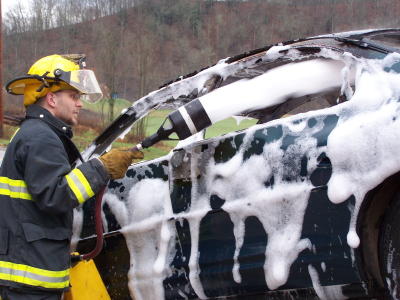 AVFD fireman Ryan Shartiger quickly puts out blaze Following a wrecker-car collision yesterday on Rt. 16 south of Chloe, Furr's Wrecker Service dispatched three wreckers to the scene, transporting the wrecked vehicles back to Grantsville. Following the collision, the vehicles caught on fire. Owners of the service, Tom and Dick Ullum, had a problem while transporting the car down the West Fork near Arnoldsburg. The car re-ignited on the back of a flat-bed wrecker, and a call was made to the Arnoldsburg VFD for assistance. Firemen quickly extinguished the blaze. See additional story Four Sent To Hospital