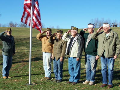 Vets salute "Old Glory" during dedication in honor VFW Post 5959, Grantsville, erected a flag pole and raised a flag in honor of Herb Smith, adjacent to Calhoun Park Community Park Barn, a facility recently dedicated to Smith for his tireless efforts in getting the project completed