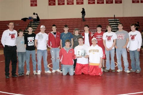Calhoun High School Wrestling Team - Front (L-R) Cody Submitted by Penny Yeager Calhoun placed 1st in an 11 team tournament at the Calhoun Invitational held at Calhoun Middle-High School Saturday, January 19. Individuals placing were - 1st place: 130 lbs. Cody Clark; 135 lbs. Ben Laughlin; 215 lbs. Zac Yeager. 2nd place: 103 lbs. Zac Hanshaw; 112 lbs. Nick Stevens; 152 lbs. Jeff Goodrich. 3rd place: 160 lbs. Caden Arnold.