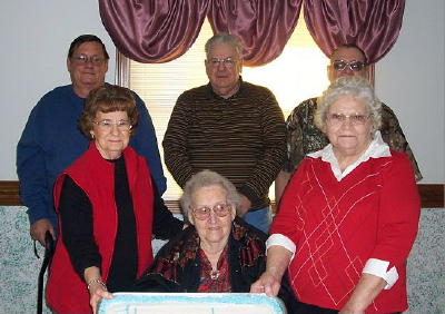 Celebrating January birthdays at the Calhoun County Committee on Aging are: Front L-R - Ruby McHenry, Frances Davis, Ruth Starcher; Back L-R - Ken Harris, Burl Simers and David Vannoy