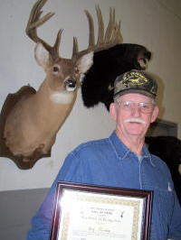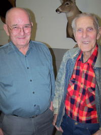 ![]() LEFT: oldtimers Paul Evans (left) and Norville McCune (right) enjoy dinner and swap tales; RIGHT: Famous Calhoun hunter Roy Pursley displays his trophy winner 11-point buck, killed on Munday Rd. in 1977 The Bear Fork Hunting Club is a throw-back to the original club which went to the remote backwoods area before 1900 to camp and hunt, often spending several weeks a year. Many of Calhoun's early citizens were involved in that venture, setting up tents, cook shacks, a country store - even a barbershop.