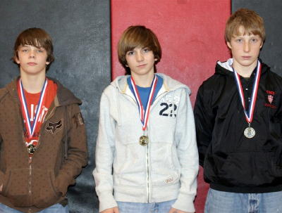 L to R - Seth Wease, Justin Yoak, Jared Submitted by Coach Elvin Hixon Calhoun Middle Wrestlers finished their season at the CWVAC Conference on February 2 at Braxton Middle School. Placing 1st in team score was Clay Middle and 2nd went to Wirt County. Conference champions for Calhoun at 5-0 were Justin Yoak, Seth Wease and Jared Haught. Individual records were - 78# Logan Moore 1-3, 84# Justin Siers 0-1, 95# Jean Blair 2-3, 102# Levi Gordon 0-5, 123# David Overbay 0-5, 135# Cory Metz 4-1, 145# Thomas Smith 2-3, 155# Cory Beder 2-3, and 171# Cody Starcher 3-2. Season records are - Moore 4-5, Siers 7-25, Blair 31-13, Gordon 6-30, Yoak 36-7, Wease 25-9, Overbay 8-30, Haught 34-5, Metz 31-12, Smith 18-19, Beder 4-5, and Starcher 13-24. Eighth grade wrestlers will be recognized on Friday, February 8 at the CMS boy's basketball game at 5 p.m. Coach Hixon and the wrestlers would like to thank everyone that helped make this season a success.