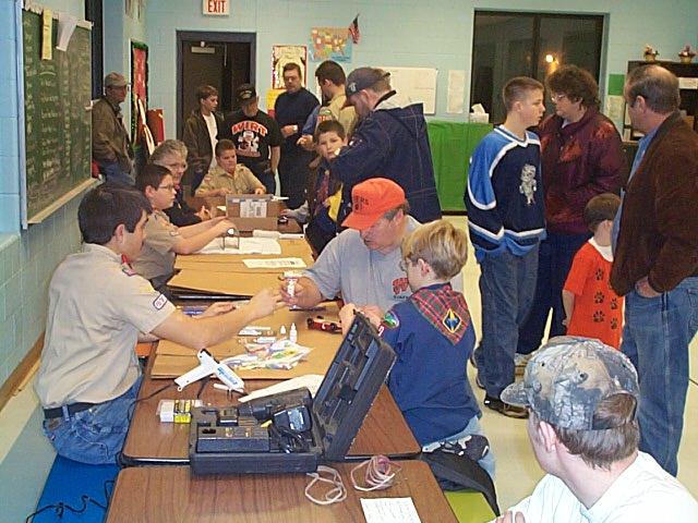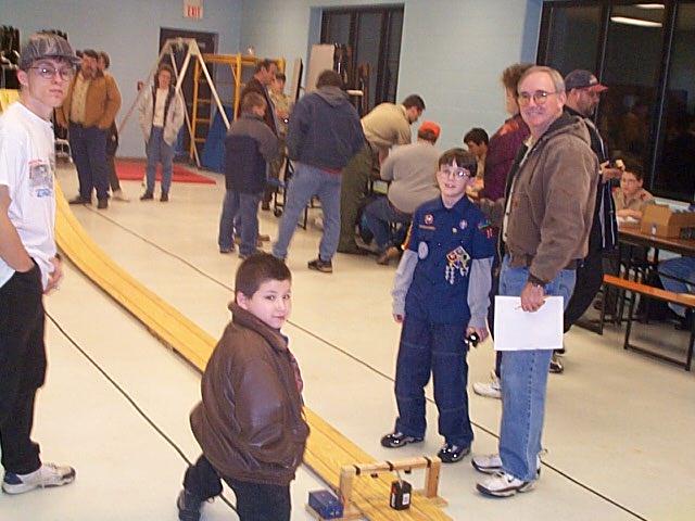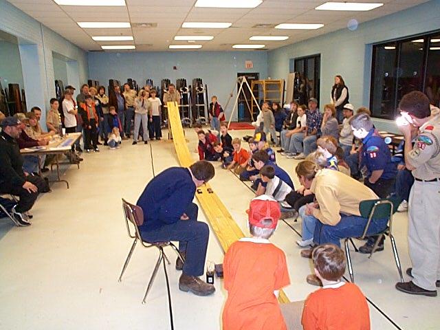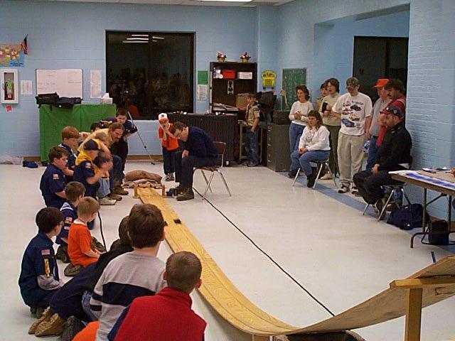 | Article and Photos By John Griffin Cub Scout Pack 30 held their annual Pinewood Derby race Thursday evening at the Wirt County Middle School cafeteria. Several Scouts, of all ages, were on hand to participate and watch the excitement as the dragsters made by the young lads, and their Dad's sped across the finish line. After several races, two cars at a time, Tiger Cubs Matthew Roberts and Nathan King placed first and second, respectively, and two year Webelos Scout Michael Davis placed third.
