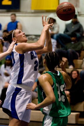 Karina Kendrick was fouled on this shot All remaining games will be at Charleston's Civic Center. The Lady Pioneers next appearance will be 6:30 p.m. Wednesday in quarterfinal action. Donita Adams led the Lady Pioneers in scoring with 23. Kendrick followed with 20, and Kristen Golden added 10.