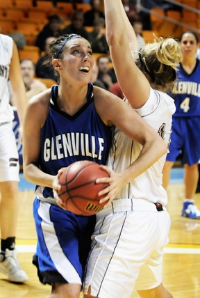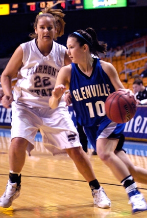 Karina Kendrick fights to score final Friday, as the 1 p.m. game got underway Fairmont took control early. They scored 11-seconds after the opening tip-off. The Lady Pioneers tied the score once, but never led during the first half. But, to their credit, despite a couple of nagging minor injuries, and Karina Kendrick's long battle with a staph infection, Glenville held on. At halftime Fairmont led by a three-point margin, 31-27. Fairmont quickly increased the lead to 11.