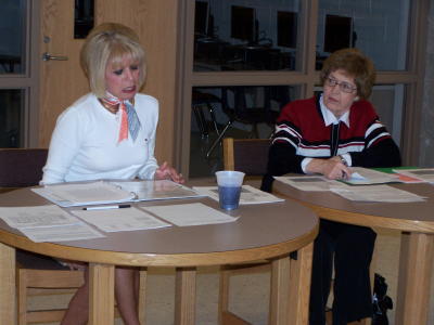 Candidates Cynthia Dale (L) and Joy Starcher (R) About a dozen people attended a "Meet the Candidates" event for Board of Education candidates yesterday evening at Calhoun Middle-High School. Incumbents, Joy Starcher and Cynthia Dale, explained their platform and answered questions. Ralph Cunningham, the third candidate, did not attend. The event was sponsored by the Calhoun Education Association. Based on districting requirements, the only candidates that will contend for a seat are Dale and Cunningham.