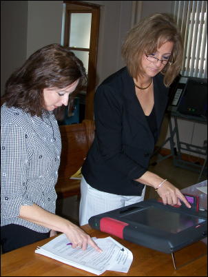 Brenda Ball (left) and Connie Smith (right) Validating Calhoun's computer voting machines began yesterday, preparing some of the devices for early voters in the county clerk's office, starting next Wednesday, April 23rd. Richard Kirby, Calhoun's chief election official, spent much of yesterday programming the early voting machines and testing them for accuracy. Calhoun's two ballot commissioners, Nancy Bremar (Republican) and Melissa Hixon (Democrat) monitored the tests, with Calhoun's three commissioners, Rick Sampson, Kevin Helmick and Bob Weaver. Kirby said "The machines have been approved for early voting," after a number of voting tests and cross-checks. The statewide primary election is Tuesday, May 13th. The last day to register is April 22nd. Absentee voting by mail has already begun and ballots will be received until May 7th.