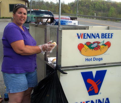 Tammy McCullough, owner of Frankie's Franks, makes hot dogs at her food cart near Speedy Mart, she has another cart at Big Otter