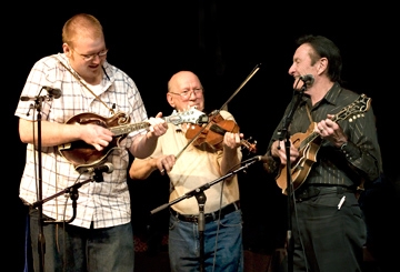 Luke Shamblin, Buddy Griffin and Jesse McReynolds onstage McReynolds is a mandolin master, credited with inventing the "cross-picking" and "split-string" styles of playing the instrument. The jam followed McReynold's recent workshop here. "I was on cloud nine," Shamblin said, "Jesse McReynolds is a legend." McReynolds was generous with his time and talents. Afterwards when asked if he was staying overnight locally, he smiled, simply responding, "I'm playing at 'the Opry' tomorrow night." Light on his feet, with a quick smile, he was in no hurry to leave Glenville. The pair shared the stage with fellow GSC bluegrass band member, Josh Chapman, and 'dean' of Glenville's bluegrass program, Buddy Griffin. Well-known pros Ashley Messenger, Jeff Roberts and Jackie Kincaid rounded out the band. Good Bluegrass Energy & Opportunities When another bluegrass legend, Melvin Goins came up short a mandolin player several weeks ago, Shamblin was invited to audition for the spot. The try-out turned out to be "a gig" to Shamblin's surprise. After two sets, Goins hired him. Melvin Goins has been a professional musician for 57 years. Several bands and musicians joined him for a celebration concert earlier this year in Prestonsburg, Kentucky. There was a parallel interest in doing "something" for the military forces serving in Iraq. As ideas blossomed he contacted Glenville State College inquiring if Griffin was interested in lending his talent to produce a music DVD. The whole affair became a "real life" learning experience for students in the bluegrass program. Three video cameras were used to cover the venue. Griffin handled post-production and editing "in house" at the college. Goins visited Glenville a few weeks ago for a final screening. According to Griffin, the plan is to distribute 1,000 copies of the concert to overseas troops. Shamblin's now working with several bands Luke Shamblin is fast becoming a sought-after talent. It's easy to see why. Of course it's a "given" considering the caliber of talent he's working with - he hits a "mean lick" on the mandolin. Plus, his temperament would likely wear well just about anywhere. After several gigs with Goins, to offset skyrocketing gasoline prices Shamblin and Goins agreed to reduce his travel requirements, and mostly use him when their gigs are in this region. Meanwhile...Mountain Fury's Lizzy Long came calling and he's working with two other groups as well. Shamblin hopes to be playing every weekend through the summer months.