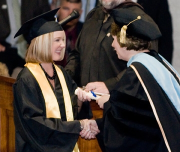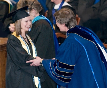 Kelly Sue Clevenger, of Camden, is congratulated by Glenville State College President Peter B. Barr during Saturday's commencement. Ms Clevenger majored in physical education; graduating with Cum Laude honors with an education degree. She was also active in student government, a cheerleader and a member of the GSC track team. Manchin said, "Most of you were born here, but even those of you who have come from other places to attend Glenville State College now have automatic rights as West Virginians. The governor and I want you to stay here in the Mountain State to look for your fame and fortune. We need your enthusiasm, your energy, and your ambition for the future of the great state of West Virginia." The GSC commencement ceremony was the second for President Dr. Peter Barr. He announced that Professor Emeritus titles were conferred upon two members of the GSC Business Department Faculty to acknowledge the value of their accumulated records of teaching, research, and community service. Business Department Chair Dr. Marty Garrett is retiring after 31 years of service to the college, while Business Department Professor Dr. James Hinter served the campus for 35 years. Barr also announced History Professor Dr. Ed Wood received the Faculty Award of Excellence, Student Activities Director Kipp Colvin received the Classified Employee of the Year Award, and Sarah Kidder of Fayetteville was the recipient of the Student Leadership Award.