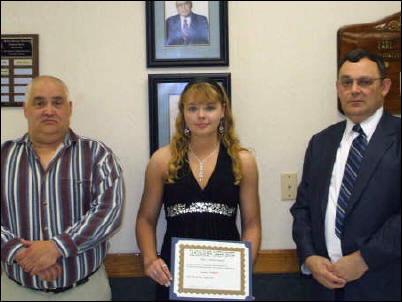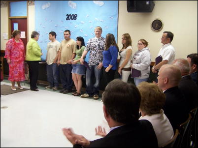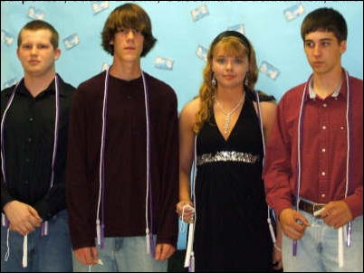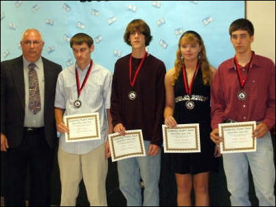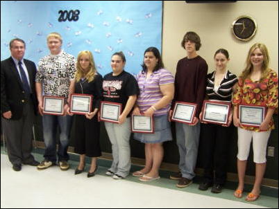 National Technical Honor Society - Kenny Carpenter, The Calhoun-Gilmer Career center honored a number of their senior students prior to graduation, with this year's theme "Hopes and Dreams". Director John Bennett welcomed the seniors and their guests to the school for a reception, a power point presentation and the awards ceremony. Director Bennett and Administrative Council Member Larry Butcher presented a certificate and medallion to Justin Brown, Cassandra Buckhannon, Dillon Hashman, and John Sampson, who were recognized with the Outstanding Students Award. These students missed no more than 5 days, maintained at least a 93% grade average, displayed acceptable attitudes in all phases of lab participation. They participated in all assigned classroom work, and actively participated in club activities. Francis Tanner and Ernestine Ball presented a $1000 scholarship to Justin Brown on behalf of VFW Post 5959, Grantsville. This was the first year that the VFW sponsored this scholarship. Kenneth Carpenter III received the Melissa Sue Oshoway Memorial Criminal Justice Scholarship for $1000. This scholarship was presented by Mr. and Mrs. John Oshoway and Mike Jackson, Criminal Justice instructor. The Earl J. Gainer Career Technical Education Student Award was established in 1990, to pay tribute to Mr. Gainer and to honor the student who best exemplifies career technical excellence. This year's award was presented to Cassandra Buckhannon. Administrative Council Member Larry Butcher presented a commemorative clock and $200 scholarship to Ms. Buckhannon. The National Technical Honor Society advisor presented Justin Brown, Cassandra Buckhannon, Kenneth Carpenter III, Dillon Hashman with a Certificate, Honor Cord and NHTS pin. Each year the Career Center awards four scholarships to graduating students who plan to pursue a career in their career and technical field. David White recognized this year's winners - Kenneth Carpenter III, Justin Brown, Cassandra Buckhannon and Sabrina King with a Certificate and $100 scholarship. Barbara Jones, Business Education Instructor presented FBLA Scholarships to Justin Brown, Chelsea Gragg, Chasity Friend and Kristin Dawson. Ken Townsend, Metal Trades Instructor presented Dillon Hashman with a certificate for placing 2nd in the State Skills USA competition in the area of precision machining. Mr. and Mrs. Michael Whipkey with the assistance of Auto Technology instructor Jim Pierce presented the Michael P. Whipkey II Scholarship for a gift certificate for a tool set from Sears to Cecil Bell. Administrative Council Member Steve Whited and Patty Cain presented a certificate and medallion to Cassandra Buckhannon and John Sampson for perfect attendance. Director Bennett presented the Director's Program Area Instructor Award to Mrs. Barbara Jones. Mrs. Jones had the group of students that completed the state's end-of course testing last year with the highest percentage of students passing. Mr. Bennett, assisted by Mr. Blankenship then presented the Ronald Blankenship Student Academic Award to those students who met the state goal on CTE end-of-course testing and WorkKeys academics in the areas of reading for information and applied mathematics. This year's winners were Cecil Bell, Justin Brown Amanda Ellyson, Jenna Eltzroth, Elizabeth Frymier, Mary Godfrey, Chelsea Gragg, Ashley Hess, Karen Hickman, Kayla Hixon, Jamie Kennedy, Michele Knicley, and Florence Parsons. These students received a certificate and their name will be placed on a plaque to hang in the school's commons area.