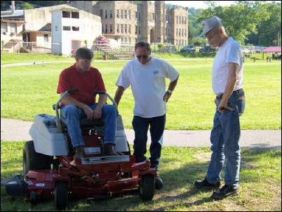 County Commissioner Rick Sampson experiments with new lawn mower at Wayne Underwood Field, purchased by Leonard Powell (L to R) Rick Sampson, Leonard Powell and Howard Johnson