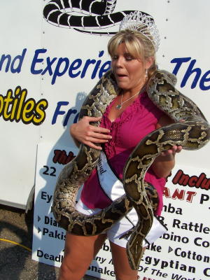 Miss Wood Festival 2008, Britanni Mills, takes time to handle a large snake Thursday evening in Grantsville