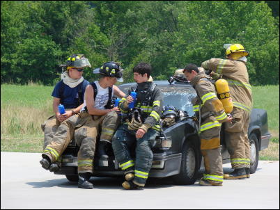 Jr. Firefighters take a break from the action To assist in the training of campers, a mobile fire training unit is used to develop the basic firefighting skills, such as forcible entry through doors and windows, roof ventilation and other ventilation techniques, search and rescue, hose line operations, and basic firefighting operations. Also used in training is a mobile aircraft simulator, which exposes firefighters to a realistic extinguishment of a simulated wheel, engine, and cabin fires. Teens 14-17 years old, interested in attending next year's firefighting camp at Jackson's Mills please contact Curtis Garretson 354-6332. "I am also interested in beginning a 4-H program for Jr. Firefighting," says Garretson. Teens 12-17 years old interested in participating in this program please call me at the above number.