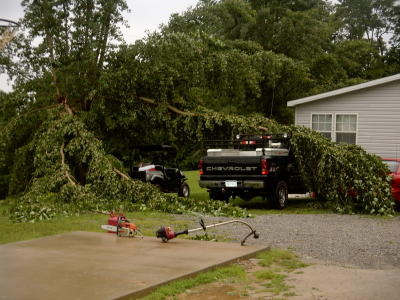 ![]() Wind, lightning and thunder swept through the Big Springs area shortly after 5 a.m. Tuesday, said Mandee Richards who submitted the these photos. Richards said, "A tree fell on my husband's company truck and my work car, and caused all of the underpinning to be pulled from our house, the second time this year." "The wind was also responsible for spinning around our 21 foot pontoon boat causing it to 'runaway' down our driveway, landing in our neighbor (my parents) garden. There was no major damage to the vehicles or boat, but I can't say that about Mom and Dad's garden, said Richards.