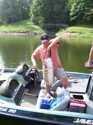 The catfish that didn't count. Ed Powell of Elizabeth landed Anglers that did return within the tournament deadline reported difficulty navigating the fog and unable to see their lines even with a light-up bobbin. Since there was no winner, the $150 prize money was rolled over into the bass tournament on Monday. Ironically, a huge 22 pound catfish was caught during the bass tournament. Unfortunately it didn't count. Bass Results The singles largest catch was actually small but it netted a $300 cash prize, which included the rollover from the catfish tourney. The winner was Harry Sutton 50 of Newton. His catch weighing 1 pound-6 ounces was just enough to surpass the other two fish weight. Several anglers reported losing a big catch during the reeling.