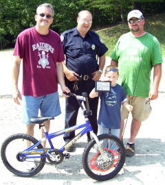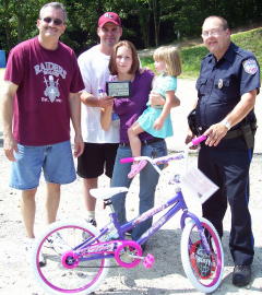 ![]() Ryan Smith and his dad Travis (left) are awarded a bicycle, plaque and large pizza as the boys fishing derby winner by City Councilman David Holland and Sergent Mikel Harper of the Spencer City Police Department. Madison Hall, her dad Joe Hall and mom Melissa Glasspell are also awarded a bicycle, plaque and large pizza as the girls fishing derby winner. Sponsors for the tournament were the City of Spencer, Houchin Construction, Minnie Hamilton Health System, Wal-Mart, Mr. and Mrs. William Truss, Roane General, McDonald's, Family Health Care, WVRC, Kerby Insurance, Pizza Hut, John Taylor Funeral Home, Michael and Martha Truss. Proceeds from the event benefit Love and Kindness ministries who promises to host more recreational opportunities for the community.