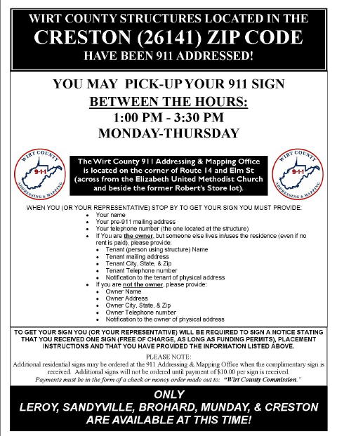CRESTON, MUNDAY, BROHARD CAN PICK-UP E-911 ADDRESSING SIGNS