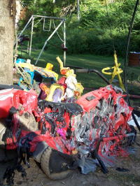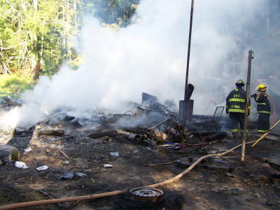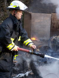 ![]() Toys in yard melted, Fireman Curt Garretson (right) helps wet-down area