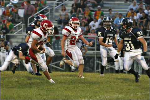 By Gaylen Duskey At halftime Friday night the question was "what is Calhoun made of?" The Red Devils had played a poor half of football ... lackadaisical. Ritchie led the Red Devils 19-13 thanks only to a couple of spectacular kick returns and the Rebels' propensity to shoot themselves in the foot by a plethora of penalties. How bad could it have been? Ritchie County had 133 yards offense at intermission with 13 first downs. The thing that kept the Rebels from making things more lopsided was 60 yards in penalties. That and Calhoun's kick return game that had a 62-yard punt return touchdown by Darrenger Fluharty and a 55-yard kickoff return by his older brother Randy. Randy also had a seven-yard touchdown run in the first half. Things were not going good for the Red Devils and an upset was definitely in the making. Had the Red Devils played the second half like the first ... well, they wouldn't be 2-0 today.