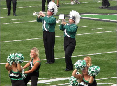 ![]() Briana Blankenship, center-right, with Marshall University band Briana Blankenship, a 2008 graduate of Calhoun County High School, is a current trumpet major at Marshall University in Huntington. Briana was a top-notch musician while at Calhoun High, receiving many honors and accolades, and is continuing to excel in her first semester at MU. She is a member of the 264-member Marching Thunder, playing 1st trumpet. She recently auditioned for the Wind Symphony and will be playing 2nd chair trumpet for this premier ensemble. She was one of 6 trumpets chosen for the 30-piece Pep Band that recently performed in Charleston for "Paint the Capitol City Green," an event to kick off the Herds football season in the Capitol City. Briana was also selected as one of five trumpet players from Marshall who will be competing in the National Trumpet Competition in Washington, DC, early this spring. The Marching Thunder will be traveling to Indianapolis to perform for the Indianapolis Colts game on September 21. The Herd Band will be the first band to perform at the new Colt's Stadium. The following Tuesday the Marching Thunder will perform at the Kanawha County Band and Majorette Festival and then to Morgantown on Saturday to perform at the Herd vs. Mountaineer game.