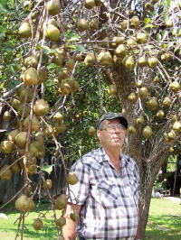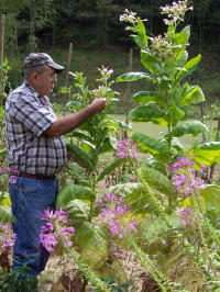 Helma's growin' a little tobacco "just for fun," By Bob Weaver Rowel's Run resident Helma Starcher and his wife Tink are among hundreds of Calhoun families that routinely try to keep ahead with their food supply, raising a garden every year throughout their marriage. This year, Tink canned 100 quarts of tomato juice and other garden varieties, a healthy and tasty experience for those long, cold winter days. Tink is the kind of grandma who joys in cooking for her grandkids and great-grandkids, the melt-in-your-mouth country stuff like biscuits and creamed tomatoes. Grandson Kenny Starcher, who is on his second tour in Iraq, always orders them up when he comes home. In fact, all of Helma and Tink's children visit their home place frequently, just like families used to do. Helma, a retired state highway department employee, revels in things that grow from the soil, from a large vegetable garden to fruit trees.