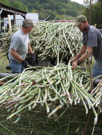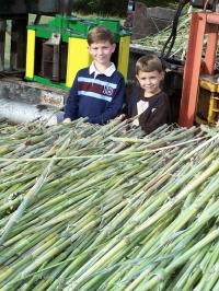 Trevor (L) and Reagan Lynch inspect the cane (left); Pink cane growers unload a supply for Friday's squeezin' (right)