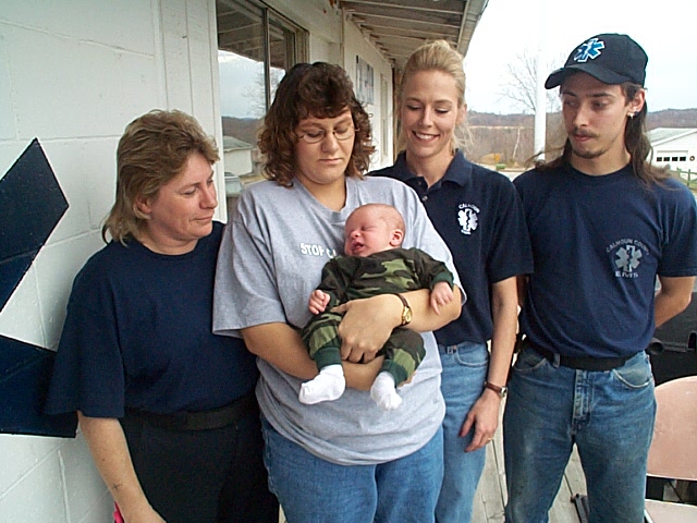 ![]() L to R - Janet Starcher (EMS), mother Angela Jones and Brian of Grantsville, Michelle Buck (EMS) who delivered the infant, and Mike Little (EMS). Little Brian was nine days old when he and his mom visited Calhoun EMS yesterday afternoon. The infant was born en route to Roane General Hospital. |