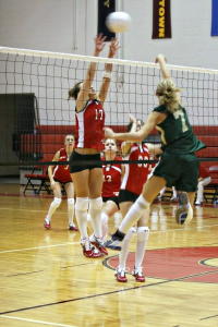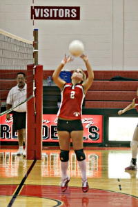 Tessa Batten (L) goes up for block against Tessa Batten has been named to the First Team Class A All-State Volleyball Team. Tessa is a Senior, Outside Hitter, for the Lady Red Devils. Her regular season stats are 94.2% Service Percentage, 182 Service Points, 41 Aces; Hitting 521/540 with 181 kills; 38 Solo Blocks. Ashley Houchin received Honorable Mention on the Class A All-State Volleyball Team. Ashley is a Sophomore, Setter, for the Lady Red Devils. Her regular season stats are 93.3% Service Percentage, 181 Service Points, 49 Aces; Setting: 1578/1599, 428 Assists; 29 Blocks.
