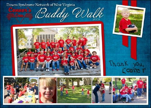 ![]() Connor Boggs, 7 year old son of Steve and Paula Boggs of Arnoldsburg, participated in the 2008 Down Syndrome Buddy Walk held at the State Capitol in Charleston, Saturday, October 11. The Buddy Walk is sponsored by the Down Syndrome Network of West Virginia (DSNWV). The Walk was developed by the National Down Syndrome Society to promote the acceptance and inclusion of all people with Down Syndrome. Connor had a wonderful team of 41 loved ones who supported him at the walk and many more people that support him who could not be at the walk with him. As he crossed the finish line, he was presented with a medal. Connor's Crew, made up of family and friends, helped Connor raise $2,500 for the Down Syndrome Network of WV. Connor's Crew is already planning future fundraisers for the DSNWV. Connor's Crew for the 2008 Buddy Walk were: Jim (Grampster) and Pauline (Nana) Ferrell; Kyle, Tracy, Addie and Jace Lancaster; Deb Mace; JoLynn, Hannah and Holly Wilson; Marvin, Millie, Stacey, Tori and Shayla Arnold; Joyce and James Williams; Rachael Tanner; Janet Marks; Denise and Bridget Carter; Connie Lane; Dave, Tina, Tiffany and Allie Brannon; John and Sue Oshoway; Renita, Katie, Marsha Benson; Don, Tami, Natalie, and Luke Allen; Steve, Paula, Chloey, Clay, Connor, and Claire Boggs. Connor would like to thank all the people who helped raise money for this great cause and who support him everyday! |