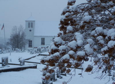 Snow covers "snow balls" of Viburnum tree at Mt. Zion Cemetery