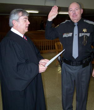 Sheriff Parsons (right) being sworn Sheriff Allen Parsons will be returning to the post on January 1st, commencing what may be a record-breaking fifth term. "We've had a lot of hours up and down these country roads. I thank the people of Calhoun for trusting me with the job again," Parsons said. Parsons said he will be answering calls, with the Sheriff's Department having two deputies with at least one part-time deputy, yet to be hired. "That's not enough for 24/7, but we'll prioritize calls and be responsive." "The deputies will be out there doing the job," he said, providing service to the public. Parson's said "We have pretty limited resources in our county, so we hope to maintain a harmonious relationship with officials, agencies and services."P> Parson's concluded by saying "We will always seek the help and support of the public in solving crimes."