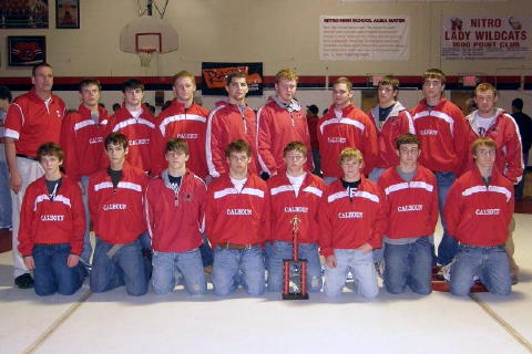 Front (L-R) Jean Blair, Zack Hanshaw, Seth Wease, Cody Calhoun Red Devil Wrestlers placed first, for the first time ever, in the 39th Pat Vance Invitational held at Nitro High School Friday and Saturday. Calhoun had a total of 228 points, followed by George Washington with 210 points. Twenty-two teams participated in the event. Red Devils, Ben Laughlin and Aaron Yoak were first place wrestlers. Second place winners were, Nick Stevens, Cody Clark and Jeremy Conley. Third place winner was, Caden Arnold, fourth place winners were, Austin Moore and Sean Gungle and coming in at 6th place was Harley Hamrick. For complete Pat Vance Invitational results see www.wvmat.com