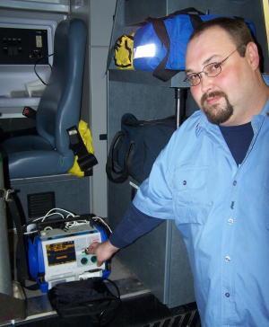 ![]() Danny May demonstrates one of two new heart monitor-defibrillators placed in service by Calhoun Emergency Services, the quite expensive equipment will be used to treat heart attack patients and individuals who experience cardiac arrest |