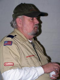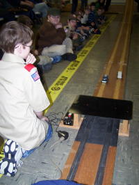 Cars approach finish line as Scoutmaster Paul Funk looks on